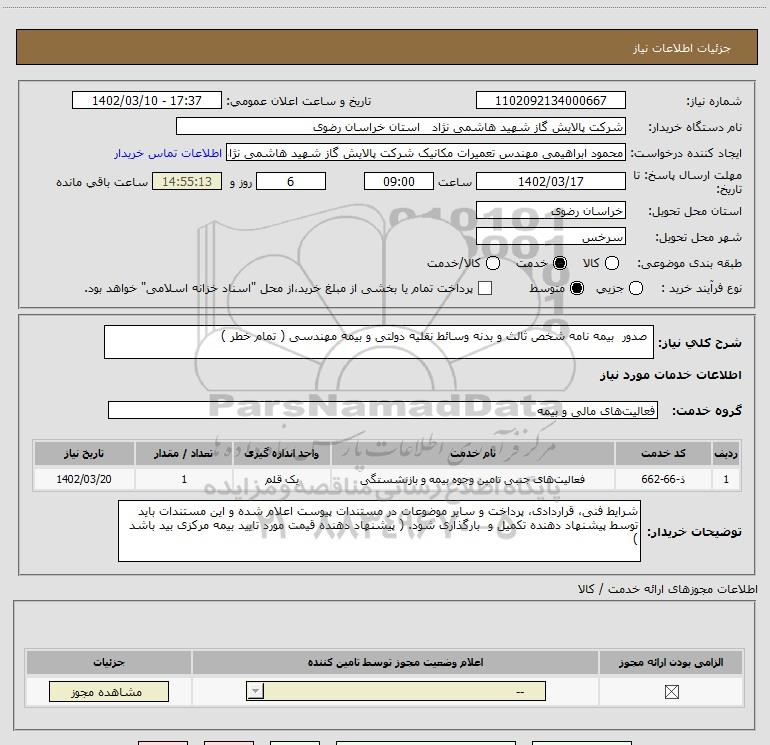 نام دستگاه خریدار:شرکت پالایش گاز شهید هاشمی نژاد استان خراسان رضوی