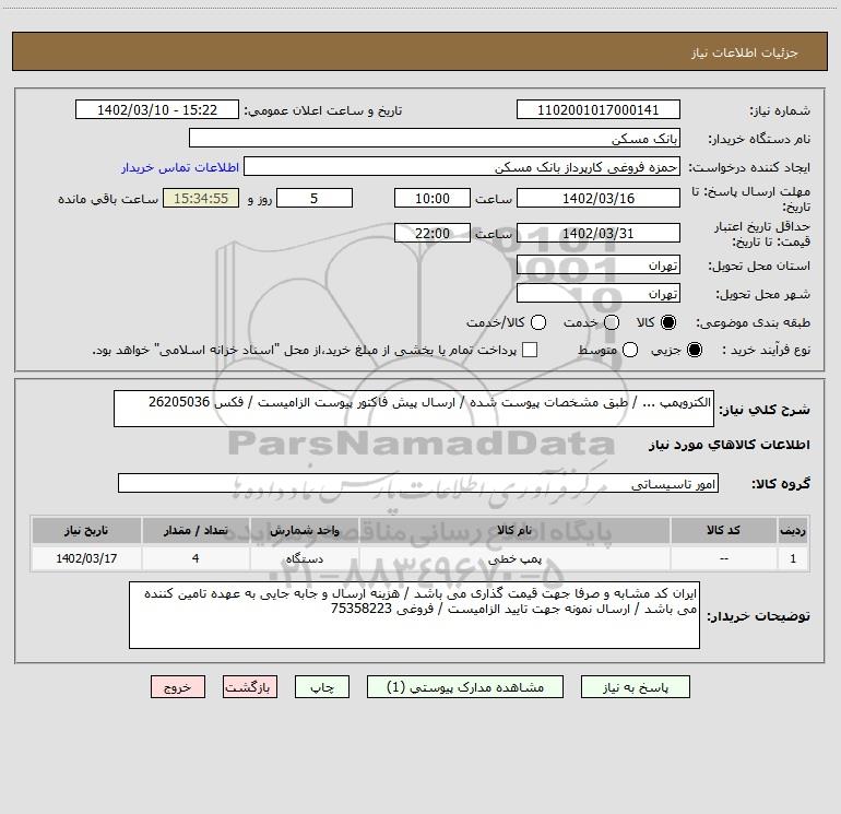 شرح کلی نیاز: الکتروپمپ ... / طبق مشخصات پیوست شده / ارسال پیش فاکتور پیوست الزامیست / فکس 26205036