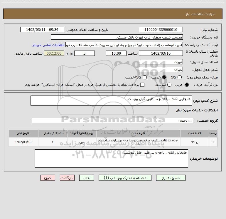 شرح کلی نیاز: جابجایی اثاثه ، باجه و ... طبق فایل پیوست