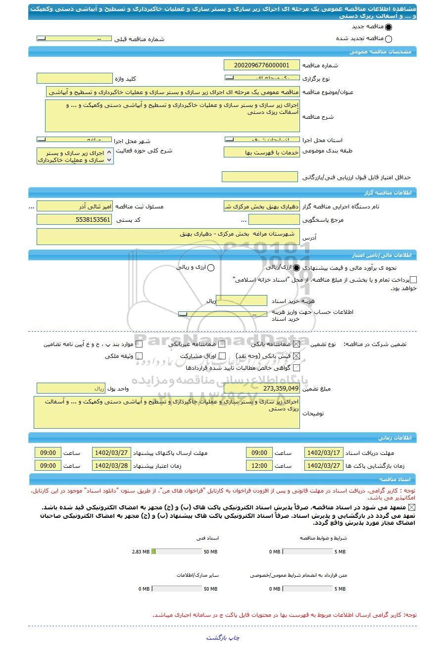 | نام دستگاه اجرایی مناقصه گزار | دهیاری بهنق بخش مرکزی شهرستان مراغه | مسئول ثبت مناقصه | امیر ثنائی آذر |