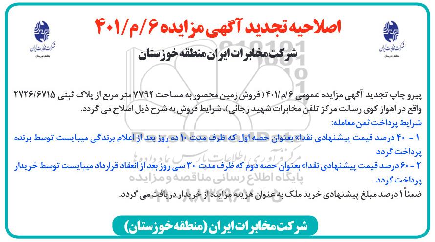 اصلاحیه تجدید آگهی مزایده 6/ م/ 401
