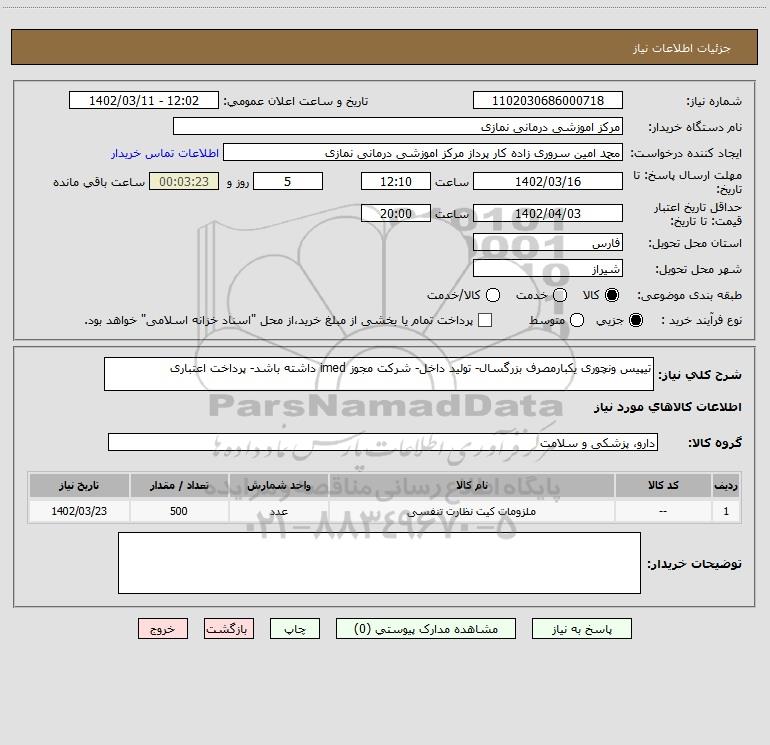 شرح کلی نیاز: تیپیس ونچوری یکبارمصرف بزرگسال- تولید داخل- شرکت مجوز imed داشته باشد- پرداخت اعتباری