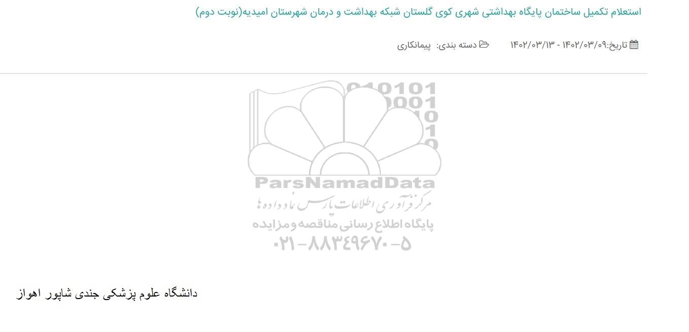 استعلام تکمیل ساختمان پایگاه بهداشتی شهری کوی گلستان شبکه بهداشت و درمان شهرستان امیدیه