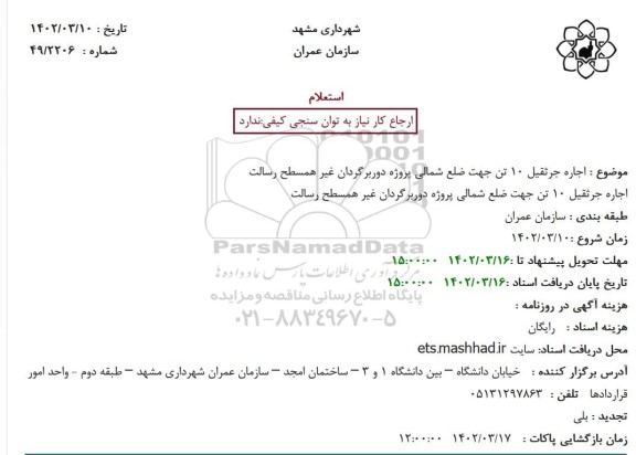 آدرس برگزار کننده : خیابان دانشگاه – بین دانشگاه 1 و 3 – ساختمان امجد – سازمان عمران شهرداری مشهد – طبقه دوم - واحد امور قراردادها تلفن : 05131297863
