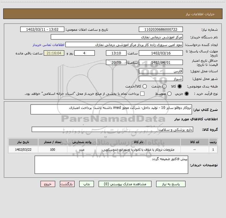 شرح کلی نیاز: تروکار دوقلو سایز 10 - تولید داخل- شرکت مجوز imed داشته باشد- پرداخت اعتباری