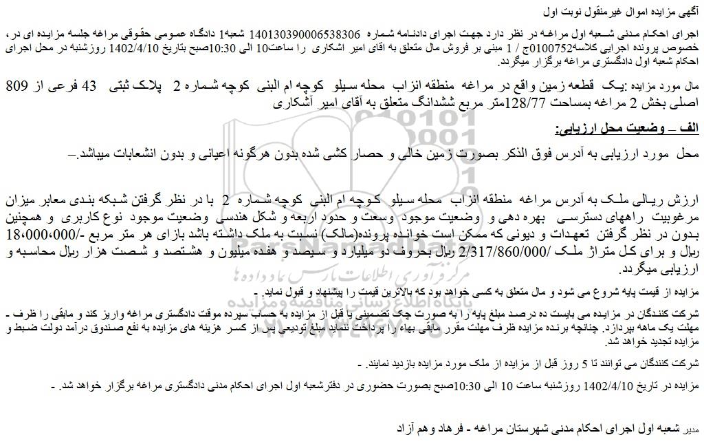- مزایده در تاریخ 1402/4/10 روزشنبه ساعت 10 الی 10:30صبح بصورت حضوری در دفترشعبه اول اجرای احکام مدنی دادگستری مراغه برگزار خواهد شد.