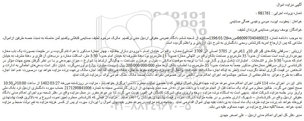،به موجب دادنامه شماره 960997040460023مورخه1396/01/26صادره از شعبه ششم دادگاه عمومی حقوقی اردبیل مبنی برتقسیم  ماترک مرحوم لطیف صنایعی قنبلانی وتقسیم ثمن حاصله به نسبت حصه طرفین ازاموال مشاعی که پس ازارجاع امربه کارشناس رسمی دادگستری به شرح ذیل ارزیابی و واعلام گردیده است.