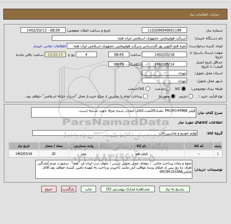 شرح کلی نیاز: فیلتر PN:04144966 ،تعداد20عدد،کالای انتخاب شده صرفا جهت تشابه است.