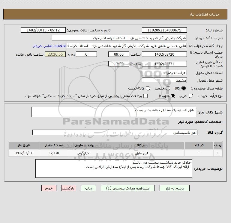 نام دستگاه خریدار:شرکت پالایش گاز شهید هاشمی نژاد استان خراسان رضوی