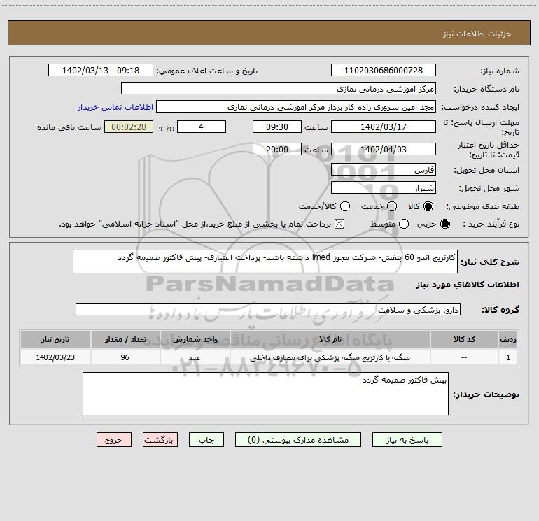شرح کلی نیاز: کارتریج اندو 60 بنفش- شرکت مجوز imed داشته باشد- پرداخت اعتباری- پیش فاکتور ضمیمه گردد