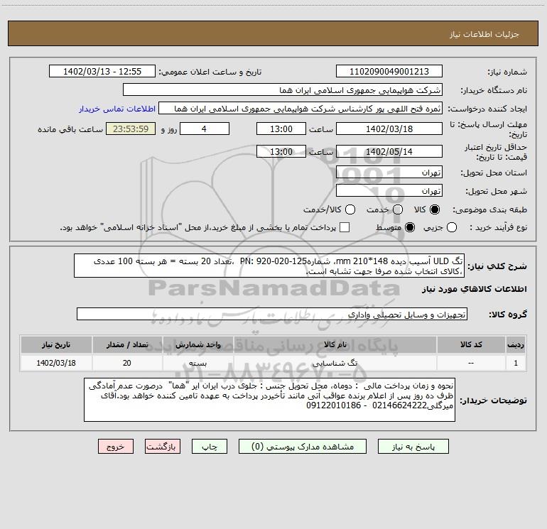 استعلام تگ ULD آسیب دیده mm 210*148، شمارهPN: 920-020-125 ،تعداد 20 بسته = هر بسته 100 عددی ،کالای انتخاب شده صرفا جهت تشابه است., استعلام تگ ULD آسیب دیده mm 210*148، شمارهPN: 920-020-125 ،تعداد 20 بسته = هر بسته 100 عددی ،کالای انتخاب شده صرفا جهت تشابه است.