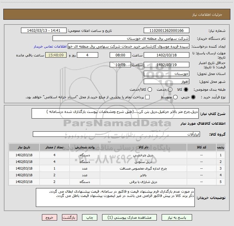 شرح کلی نیاز: دریل.چرخ متر بالابر جرثقیل.دریل بتن کن....(طبق شرح ومشخصات پیوست بارگذاری شده درسامانه )