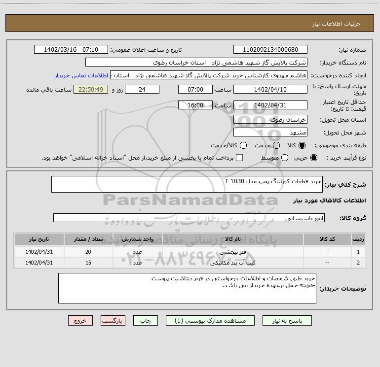 شرح کلی نیاز: خرید قطعات کوپلینگ پمپ مدل 1030 T