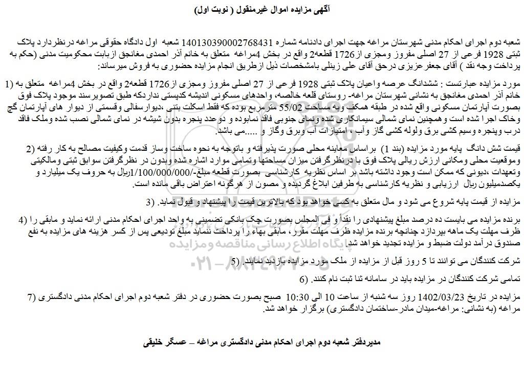 شعبه دوم اجرای احکام مدنی شهرستان مراغه جهت اجرای دادنامه شماره 140130390002768431 شعبه  اول دادگاه حقوقی مراغه درنظردارد پلاک ثبتی 1928 فرعی از 27 اصلی مفروز ومجزی از1726 قطعه2 واقع در بخش 4مراغه  متعلق به خانم آذر احمدی مغانجق ازبابت محکومیت مدنی (حکم به پرداخت وجه نقد ) آقای جعفرعزیزی درحق آقای علی زینلی بامشخصات ذیل ازطریق انجام مزایده حضوری به فروش میرساند:
