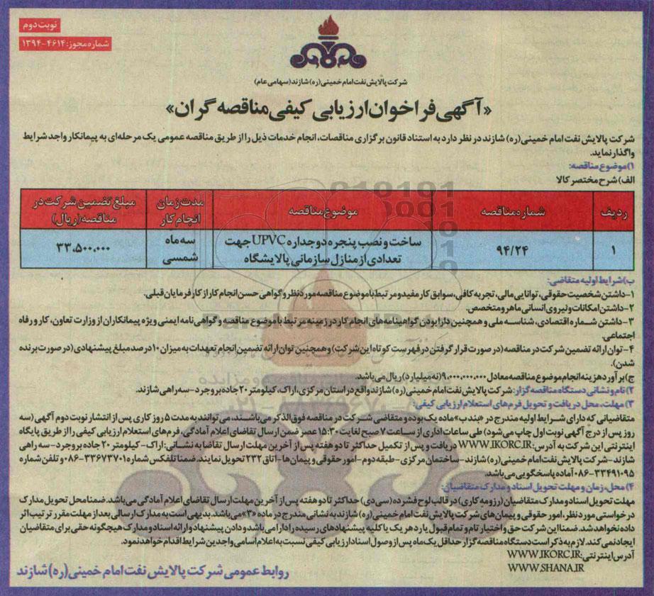 | 94/24 | ساخت و نصب پنجره دو جداره upvc جهت تعدادی از منازل سازمانی پالایشگاه |
