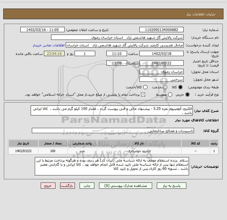 شرح کلی نیاز: الکترود آلومینیوم نمره 3.25 - پیشنهاد مالی و فنی پیوست گردد . مقدار 100 کیلو گرم می باشد . کالا ایرانی باشد .