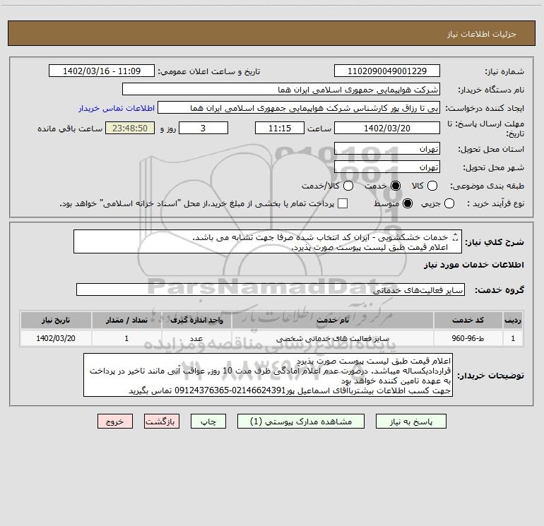 شرح کلی نیاز: خدمات خشکشویی - ایران کد انتخاب شده صرفا جهت تشابه می باشد. اعلام قیمت طبق لیست پیوست صورت پذیرد. لیست اقلام خشکشویی درفایل پیوست