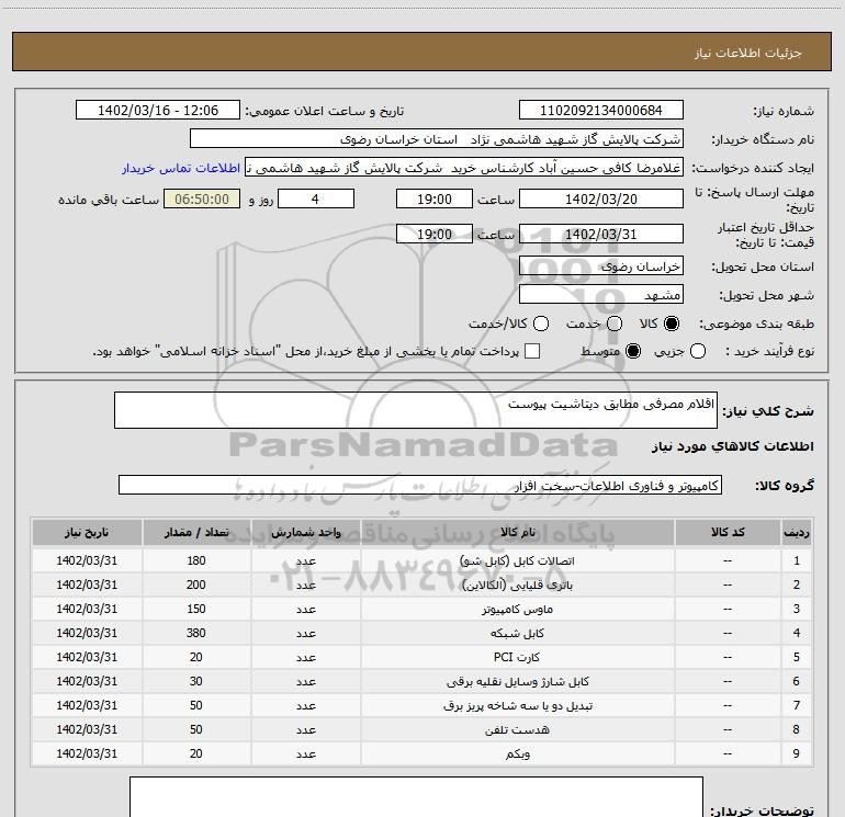 نام دستگاه خریدار:شرکت پالایش گاز شهید هاشمی نژاد استان خراسان رضوی