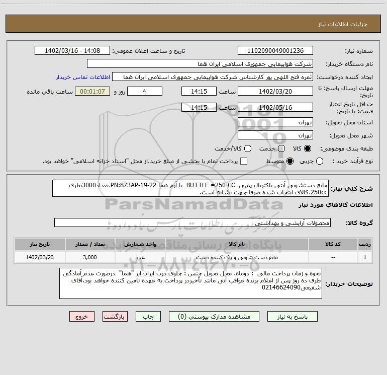 شرح کلی نیاز: مایع دستشویی آنتی باکتریال پمپی BUTTLE =250 CC با آرم هما PN:873AP-19-22،تعداد3000بطری 250cc،کالای انتخاب شده صرفا جهت تشابه است.