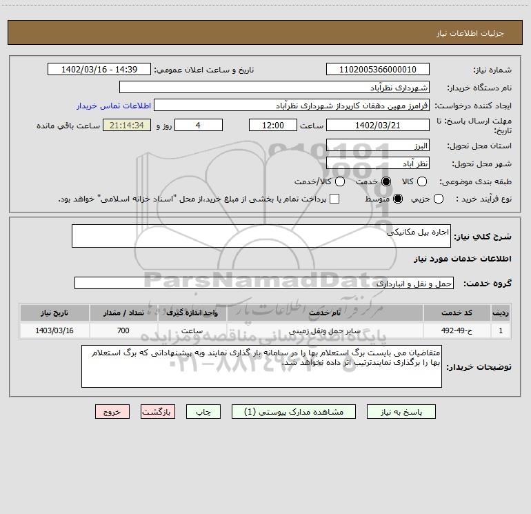 شرح کلی نیاز: اجاره بیل مکانیکی