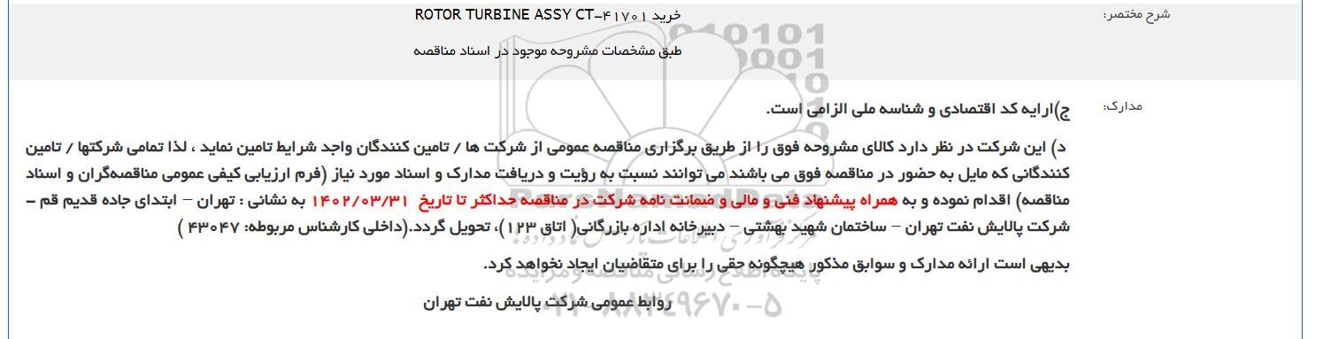 فراخوان خرید ROTOR TURBINE ASSY CT-41701 از کلیه افراد متخصص و شرکتها واجد شرایط دعوت به عمل میآید در مناقصه با کد خبرگزاری پارس نماد: 5916752 شرکت نمایند.