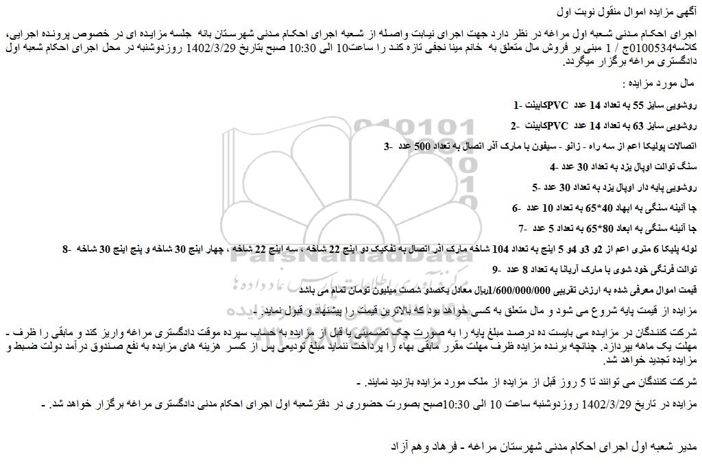 - مزایده در تاریخ 1402/3/29 روزدوشنبه ساعت 10 الی 10:30صبح بصورت حضوری در دفترشعبه اول اجرای احکام مدنی دادگستری مراغه برگزار خواهد شد.