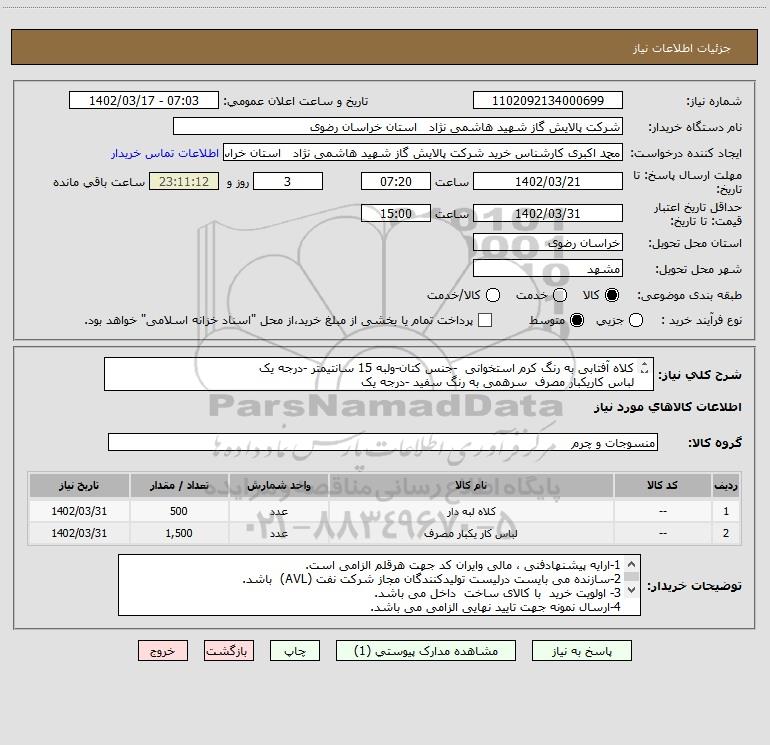 نام دستگاه خریدار:شرکت پالایش گاز شهید هاشمی نژاد استان خراسان رضوی