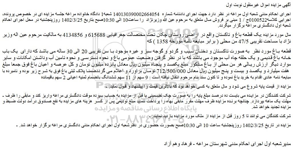 مال مورد مزایده :یک قطعه باغ و تاکستان واقع در اراضی روستای چکان تحت مختصالت جغرافیایی 615688 و 4134856 به مالکیت مرحوم عین اله وزیر نژاد با مساحت تقریبی 47/5 من محلی ( برابر مبایعه نامه مورخه 1358 ) که