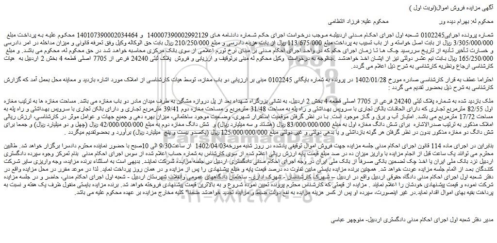 شماره پرونده اجرایی0102245 شعبه اول اجرای احکام مدنی اردبیلبه موجب درخواست اجرای حکم شماره دادنامه های 140007390002992129 و 140107390002034464 محکوم علیه به پرداخت مبلغ 3/305/000/000 ریال از بابت اصل خواسته و از باب تسبیب به پرداخت مبلغ 113/675/000 ریال از بابت هزینه دادرسی و مبلغ 210/250/000 ریال بابت حق الوکاله وکیل وفق تعرفه قانونی و میزان مداخله در امر دادرسی و خسارت تأخیر تأدیه از تاریخ سررسید چک ها تا زمان اجرای حکم که در واحد اجرای احکام مدنی بر مبنای نرخ تورم اعلامی از سوی بانک مرکزی محاسبه خواهد شد در حق محکوم له، محکوم می باشد. و مبلغ 165/250/000 ریال بابت نیم عشر دولتی نیز از ایشان اخذ خواهدشد .،باتوجه به درخواست وکیل محکوم له مبنی برتوقیف و ارزیابی و فروش پلاک ثبتی 24240 فرعی از 7705 اصلی قطعه 4 بخش 2 اردبیل به هیات کارشناسی ارجاع ونظریه کارشناسی به شرح ذیل اعلام می گردد.