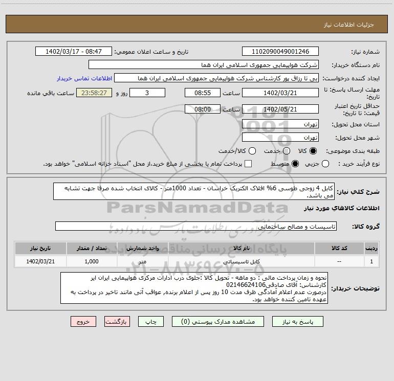 شرح کلی نیاز: کابل 4 زوجی طوسی 6% افلاک الکتریک خراسان - تعداد 1000متر - کالای انتخاب شده صرفا جهت تشابه می باشد.