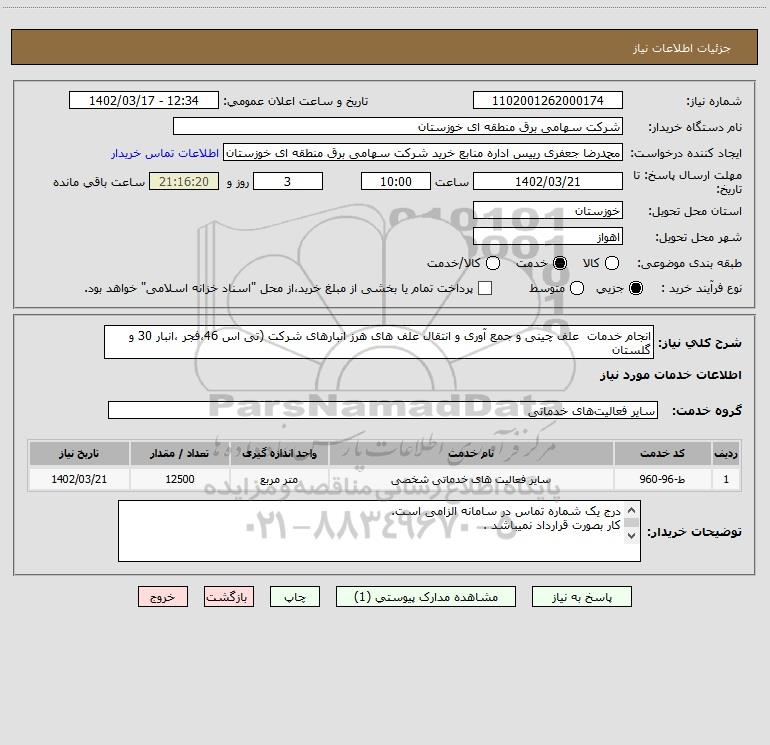شرح کلی نیاز: انجام خدمات علف چینی و جمع آوری و انتقال علف های هرز انبارهای شرکت (تی اس 46،فجر ،انبار 30 و گلستان