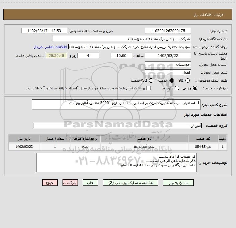 شرح کلی نیاز: 1- استقرار سیستم مدیریت انرژی بر اساس استاندارد ایزو 50001 مطابق آنالیز پیوست