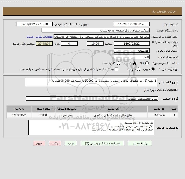شرح کلی نیاز: 1- تهیه گزارش ممیزی انرژی بر اساس استاندارد ایزو 50002 به مساحت 34000 مترمربع