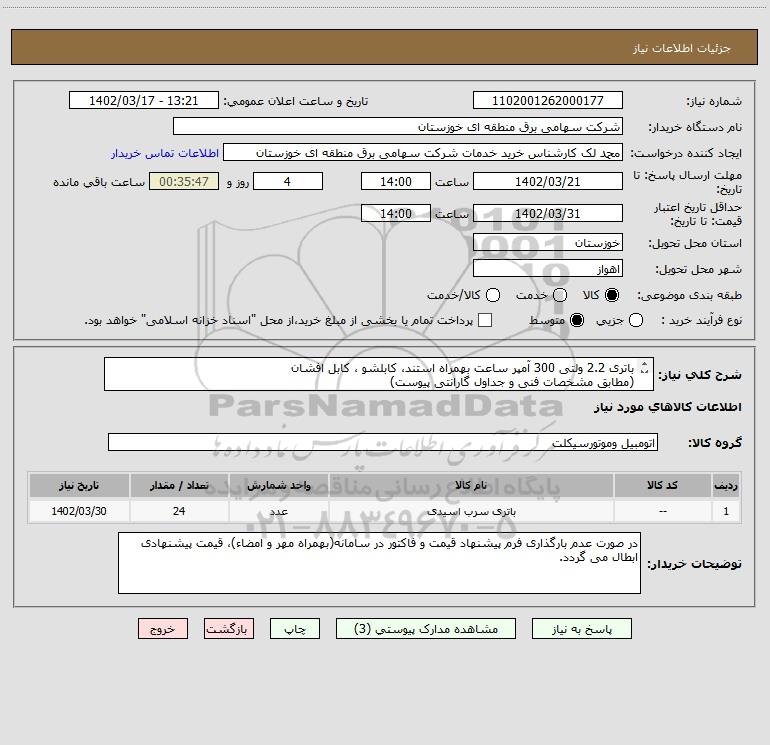 شرح کلی نیاز: باتری 2.2 ولتی 300 آمپر ساعت بهمراه استند، کابلشو ، کابل افشان