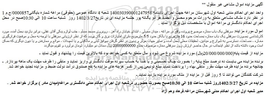 - مزایده در تاریخ 1402/3/27روز شنبه ساعت 10 الی 10:30صبح بصورت حضوری درشعبه اول اجرای احکام مدنی دادگستری مراغه(میدان مادر ) برگزار خواهد شد.