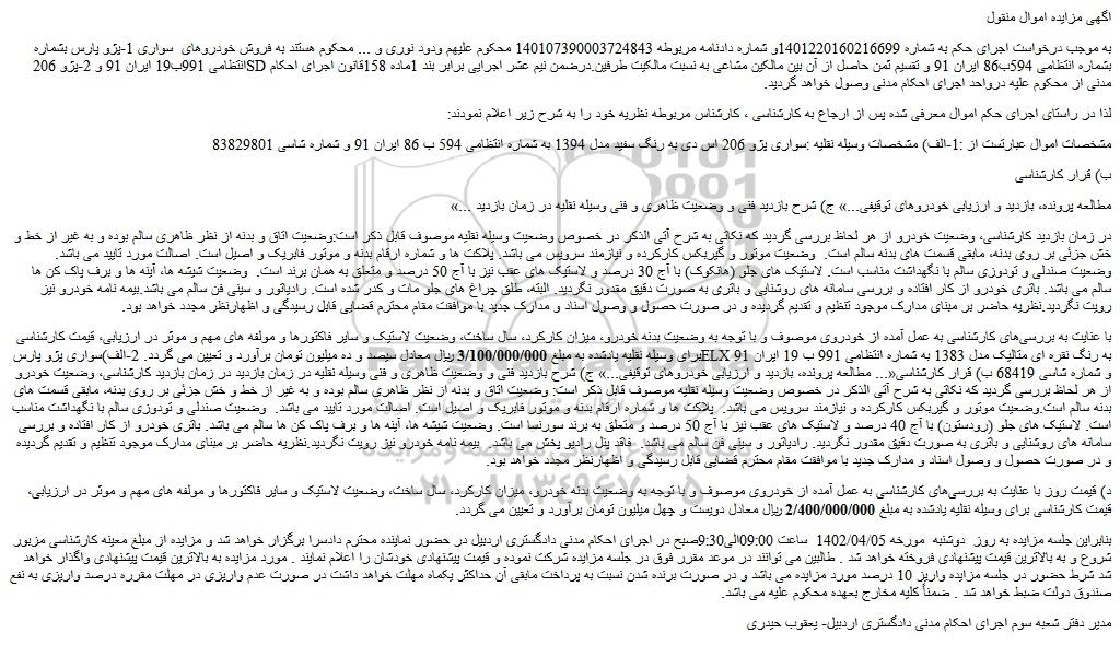 به موجب درخواست اجرای حکم به شماره 1401220160216699و شماره دادنامه مربوطه 140107390003724843 محکوم علیهم ودود نوری و ... محکوم هستند به فروش خودروهای سواری 1-پژو پارس بشماره انتظامی 991ب19 ایران 91 و 2-پژو 206 SD بشماره انتظامی 594ب86 ایران 91 و تقسیم ثمن حاصل از آن بین مالکین مشاعی به نسبت مالکیت طرفین.درضمن نیم عشر اجرایی برابر بند 1ماده 158قانون اجرای احکام مدنی از محکوم علیه درواحد اجرای احکام مدنی وصول خواهد گردید.