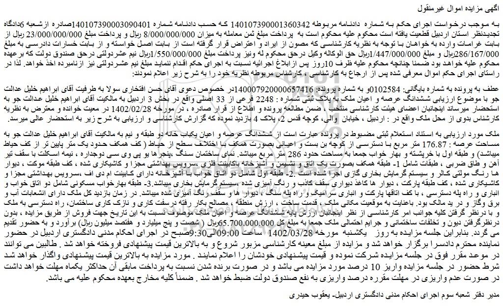 به موجب درخواست اجرای حکم به شماره  دادنامه مربوطه 140107390001360342 که حسب دادنامه شماره 140107390003090401صادره ازشعبه 6دادگاه تجدیدنظر استان اردبیل قطعیت یافته است محکوم علیه محکوم است به  پرداخت مبلغ ثمن معامله به میزان 8/000/000/000 ریال و پرداخت مبلغ 23/000/000/000 ریال از بابت غرامات وارده به خواهان با توجه به نظریه کارشناسی که مصون از ایراد و اعتراض قرار گرفته است از بابت اصل خواسته و از بابت خسارات دادرسی به مبلغ 286/167/000ریال و مبلغ 1/447/000/000ریال حق الوکاله وکیل درحق محکوم له ونیز پرداخت مبلغ 1/550/000/000ریال نیم عشردولتی درحق صندوق دولت که برعهده محکوم علیه خواهد بود ضمنا چنانچه محکوم علیه ظرف 10روز پس ازابلاغ اجرائیه نسبت به اجرای حکم اقدام ننماید مبلغ نیم عشردولتی نیز ازنامبرده اخذ خواهد. لذا در راستای اجرای حکم اموال معرفی شده پس از ارجاع به کارشناسی ، کارشناس مربوطه نظریه خود را به شرح زیر اعلام نمودند: