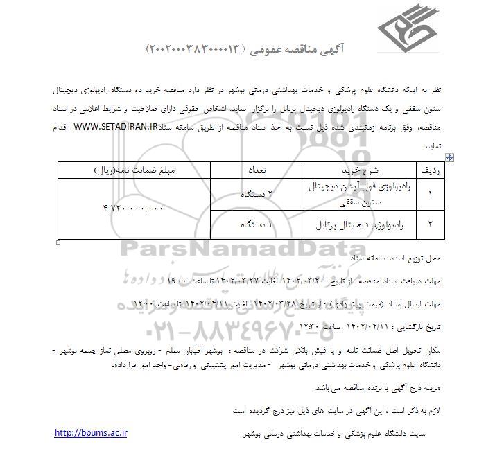 نظر به اینكه دانشگاه علوم پزشكی و خدمات بهداشتی درمانی بوشهر در نظر دارد مناقصه خرید دو دستگاه رادیولوژی دیجیتال ستون سقفی و یک دستگاه رادیولوژی دیجیتال پرتابل را برگزار نماید. اشخاص حقوقی دارای صلاحیت و شرایط اعلامی در اسناد مناقصه، وفق برنامه زمانبندی شده ذیل نسبت به اخذ اسناد مناقصه از طریق سامانه ستاد اقدام نمایند.