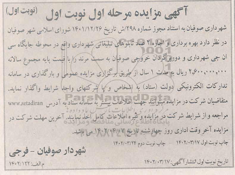 شهرداری صوفیان در نظر دارد بهره برداری و اجاره 2 عدد تابلوهای تبلیغاتی شهرداری واقع در محوطه جایگاه سی ان جی شهرداری و دوربرگردان خروجی صوفیان به سمت مرند را با قیمت پایه مجموع سالانه 2.600.000.000 ریال به مدت 1 سال از طریق برگزاری مزایده عمومی و بارگذاری در سامانه تدارکات الکترونیکی دولت ستاد به آشخاص و یا شرکت های واجد شرایط واگذار نماید
