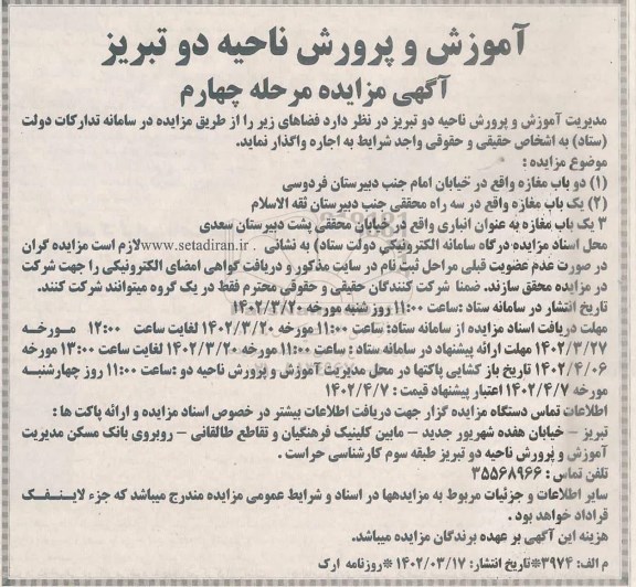 مرحله چهارم مزایده دوباب مغازه ..., مرحله چهارم مزایده دوباب مغازه ...