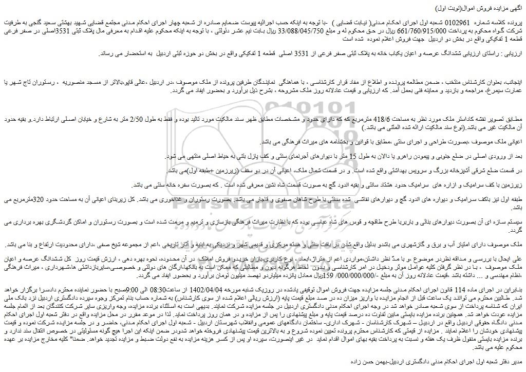 پرونده کلاسه شماره 0102961 شعبه اول اجرای احکام مدنی( نیابت قضایی ) -با توجه به اینکه حسب اجرائیه پیوست ضمایم صادره از شعبه چهار اجرای احکام مدنی مجتمع قضایی شهید بهشتی سعید گنجی به طرفیت شرکت گواه محکوم به پرداخت 661/760/915/000 ریال در حق محکوم له و مبلغ 33/088/045/750 ریال بابت نیم عشر دئولتی ، با توجه به اینکه محکوم علیه اقدام به معرفی مال پلاک ثبتی 3531اصلی در صفر فرعی قطعه 1 تفکیکی واقع در بخش دو اردبیل جهت فروش اعلام نموده شده است