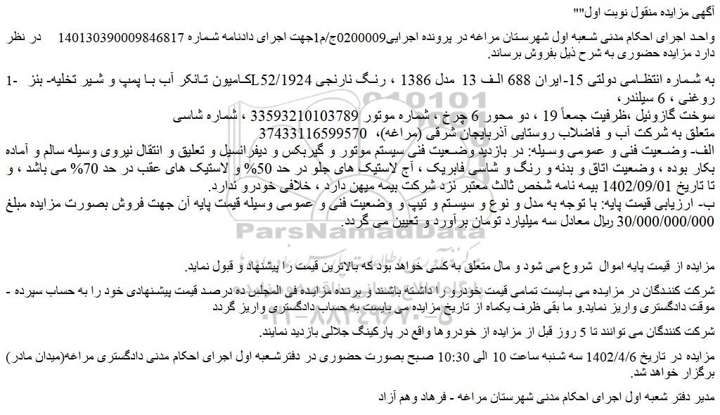 مزایده در تاریخ 1402/4/6 سه شنبه ساعت 10 الی 10:30 صبح بصورت حضوری در دفترشعبه اول اجرای احکام مدنی دادگستری مراغه(میدان مادر) برگزار خواهد شد.