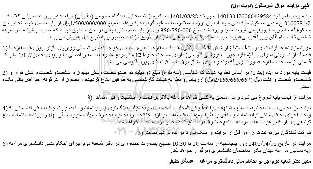به موجب اجرائیه 140130420000439584 مورخه 1401/08/28 صادره از شعبه اول دادگاه عمومی (حقوقی) مراغه در پرونده اجرایی کلاسه 0100781/2 ج مدنی محکومٌ علیه آقای جواد آبادیان فرزند غلامرضا محکوم گردیده به پرداخت مبلغ 1/500/000/000ریال از بابت اصل خواسته در حق محکومٌ له خانم پریسا پورفرجی فرزند حمید و پرداخت مبلغ 350،750،000 ریال از بابت نیم عشر دولتی در حق صندوق دولت که حسب درخواست و تعرفه شخص ثالث بنام آقای پوریا قدوسی فرزند حبیب تعداد یک باب سرقفلی مغازه از طریق مزایده حضوری به شرح ذیل بفروش می رسد: