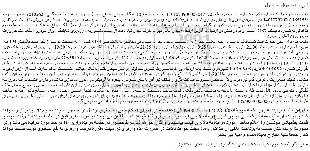 به موجب درخواست اجرای حکم به شماره دادنامه مربوطه  1401073900003047122  صادره شعبه 12 دادگاه عمومی حقوقی اردبیل و پرونده به شماره بایگانی 0102628 و شماره پرونده :140107920001185155 در خصوص دعوی آقای علی حیدری تجدد به طرفیت آقایان : محمد،رفیع،ودود و خانم ها :ملیحه ،صدیقه ،حاجیه ،همگی حیدری تجدد مبنی بر  فروش ملک مشاع و تقسیم وجوه حاصل از فروش ما بین وراث به شرح سهام مذکور در گواهی حصر وراثت با ارجاع امر به کارشناس منتخب به شرح آتی ارزیابی گردید:. از محل ملک مشاع به پلاک ثبتی شماره :قطعه دوم تفکیکی به شماره باقیمانده 3483 اصلی واقع در بخش دو اردبیل به آدرس اردبیل : میدان عالی قاپو به طرف میدان قیام ، بعد از مسجد منصوریه ، روبروی نمایندگی ایران خودرو ، ملک مشاعی وراث مرحوم زین العابدین حیدری