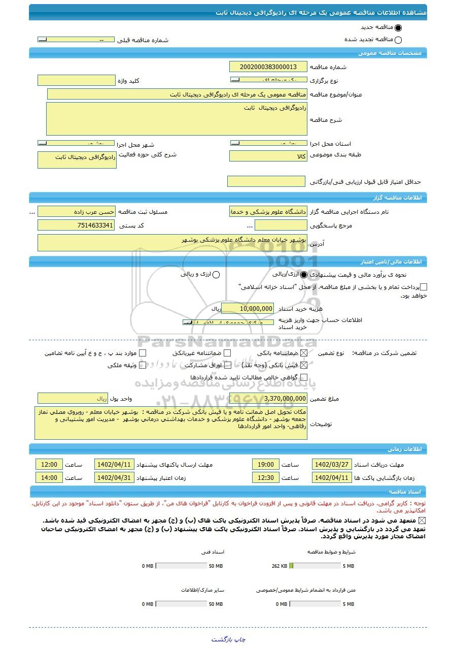 | نام دستگاه اجرایی مناقصه گزار | دانشگاه علوم پزشکی و خدمات بهداشتی درمانی بوشهر | مسئول ثبت مناقصه | حسن عرب زاده |