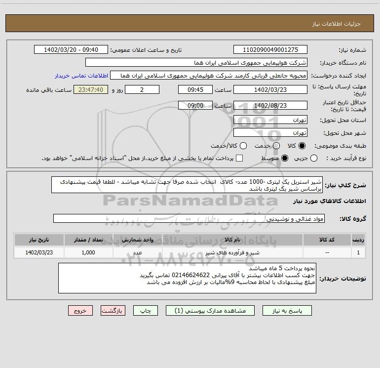 شرح کلی نیاز: شیر استریل یک لیتری -1000 عدد- کالای انتخاب شده صرفا جهت تشابه میباشد - للطفا قیمت پیشنهادی براساس شیر یک لیتری باشد
