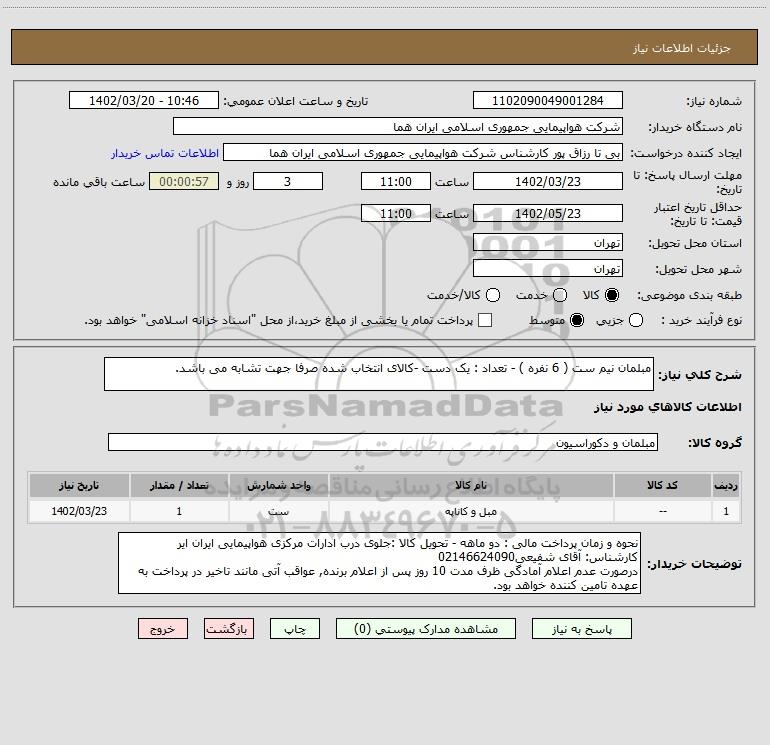 شرح کلی نیاز: مبلمان نیم ست ( 6 نفره ) - تعداد : یک دست -کالای انتخاب شده صرفا جهت تشابه می باشد.