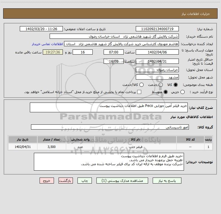 نام دستگاه خریدار:شرکت پالایش گاز شهید هاشمی نژاد استان خراسان رضوی
