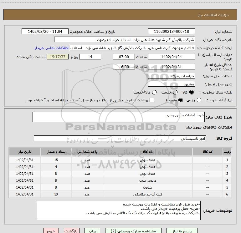 نام دستگاه خریدار:شرکت پالایش گاز شهید هاشمی نژاد استان خراسان رضوی
