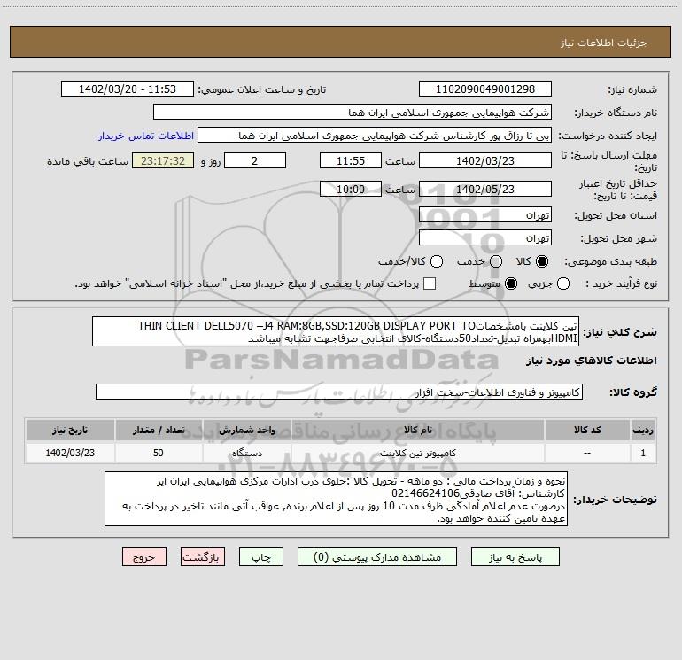 استعلام تین کلاینت بامشخصاتTHIN CLIENT DELL5070 –J4 RAM:8GB,SSD:120GB DISPLAY PORT TO HDMIبهمراه تبدیل-تعداد50دستگاه-کالای انتخابی صرفاجهت تشابه میباشد, استعلام تین کلاینت بامشخصاتTHIN CLIENT DELL5070 –J4 RAM:8GB,SSD:120GB DISPLAY PORT TO HDMIبهمراه تبدیل-تعداد50دستگاه-کالای انتخابی صرفاجهت تشابه میباشد